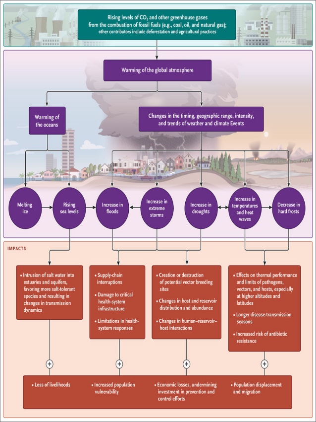 En las últimas décadas, hemos logrado mejorar la supervivencia y el bienestar infantil, incluida una reducción de la carga y la mortalidad de las enfermedades infecciosas, especialmente en los niños menores de 5 años. Sin embargo, aún queda mucho por hacer para reducir los 3 millones de muertes anuales por enfermedades transmisibles entre niños y adolescentes de todo el mundo, lo que equivale aproximadamente a una muerte cada 10 segundos. En primer lugar, los cambios que se están produciendo en los sistemas naturales amenazan con revertir los logros en materia de salud conseguidos en el último siglo. El Índice de Riesgo Climático Infantil del Fondo de las Naciones Unidas para la Infancia revela que hasta la mitad de los 2.200 millones de niños del mundo corren un «riesgo extremadamente alto» de sufrir los efectos del cambio climático, y las expectativas actuales sólo auguran un aumento en las próximas décadas. Más de la mitad de las enfermedades infecciosas humanas conocidas pueden verse exacerbadas por el cambio climático. Por ejemplo, cabe esperar una mayor circulación de mosquitos infectados con virus como el dengue o el zika, ya observada en las zonas mediterráneas europeas, como consecuencia del aumento de las temperaturas. Una reciente revisión del alcance encontró que el 81% de todas las publicaciones que investigan la relación entre el cambio climático y las enfermedades infecciosas concluyeron que el cambio climático exacerba las enfermedades infecciosas. Por lo tanto, es probable que todos los especialistas en enfermedades infecciosas pediátricas experimenten, en cierta medida, los efectos del cambio climático en las enfermedades que ven en su práctica diaria. La salud planetaria refleja la relación entre el cambio climático, los factores medioambientales y el bienestar humano.