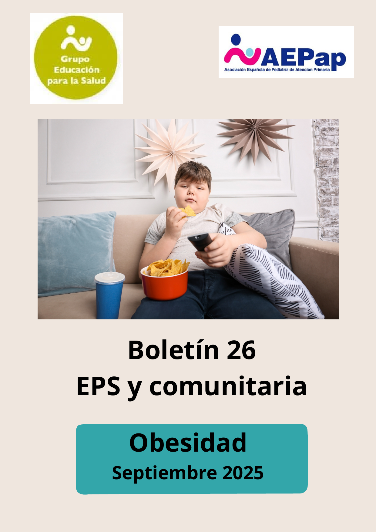 Boletines de educación para la salud Recursos para profesionales sanitarios que facilitan la educación para la salud en la consulta diaria 26. Obesidad. Septiembre 2025 25. Activos para la salud. Junio 2025 24. Cribado/Salud visual. Marzo 2025 23. Adopción y acogimiento. Diciembre 2024 22. Niños/as con altas capacidades. Septiembre 2024 21. Trastorno del espectro autista. Junio 2024 20. Pediatría ambiental. Abril 2024 19. Accidentes y seguridad vial. Diciembre 2023 18. Trastorno de déficit de atención y/o hiperactividad (TDAH). Septiembre 2023 17. Bullying: Acoso escolar. Junio 2023 16. Autocuidados para la salud y el bienestar. Marzo 2023 15. Inequidades en salud. Diciembre 2022 14. Ejercicio físico. Septiembre 2022 13. El sueño en pediatría. Junio 2022 12. Salud emocional, resiliencia y empatía. Marzo 2022 11. Educación sexual. Diciembre 2021 10. Salud y género. Septiembre 2021 9. Consejos para un verano saludable. Junio 2021 8. Uso seguro y razonable de las tecnologías de la información y comunicación. Marzo 2021 7. Alimentación saludable. Diciembre 2020 6. Consumo de alcohol y otras sustancias adictivas. Septiembre 2020 5. Redes comunitarias en tiempos de coronavirus. Junio 2020 4. Manejo del paciente pediátrico con COVID. Marzo 2020 3. Boletín EPS y salud comunitaria. Diciembre 2019 2. Boletín EPS y salud comunitaria. Septiembre 2019 1. Boletín EPS y salud comunitaria. Junio 2019